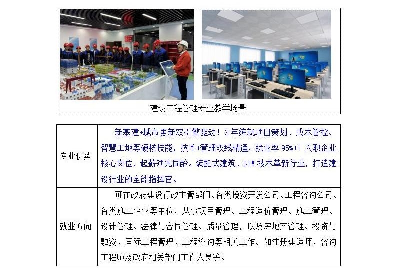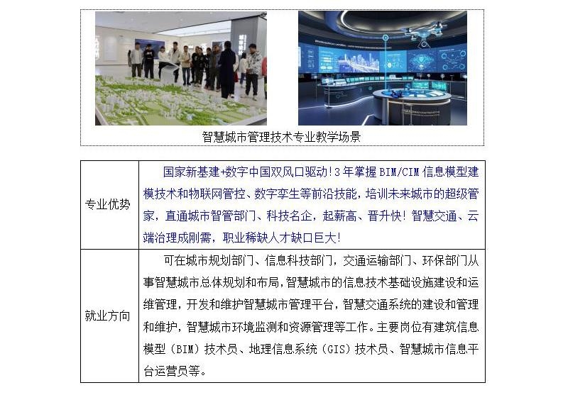 为更好服务国家重大战略任务,学院聚焦城市更新、城市建设与管理和乡村振兴,积极构建了智慧城市管理技术专业群,群内共有建无人机测绘技术、智慧城市管理技术、工程造价、建筑工程技术和建设工程管理共5个专业。其中,工程造价为省级特色骨干专业。
