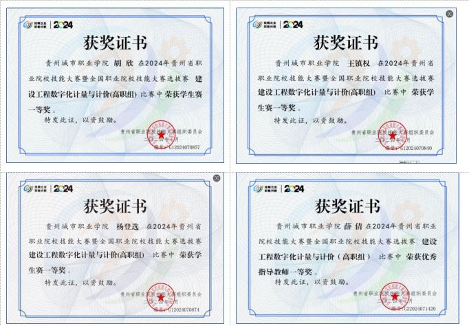 2024年在贵州省职业院校技能大赛中荣获“工程数字化计量与计价”一等奖