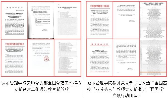 2021年4月,城市管理学院教师党支部被中共贵州省委 贵州省人民政府授予“全省脱贫攻坚先进集体”称号;2021年5月,学院教师党支部被省委教育工委评选为标准化规范化建设示范党支部;2022年,学院教师党支部获批为第三批“全国党建工作样板党支部”培育创建单位和全省第二批“三全育人”综合改革试点院系;2024年,全国党建工作样板支部建设顺利通过教育部验收并成功入选“全国高校‘双带头人’教师党支部书记‘强国行’专项行动团队”,2025年立项省级实践育人思政精品项目1项。