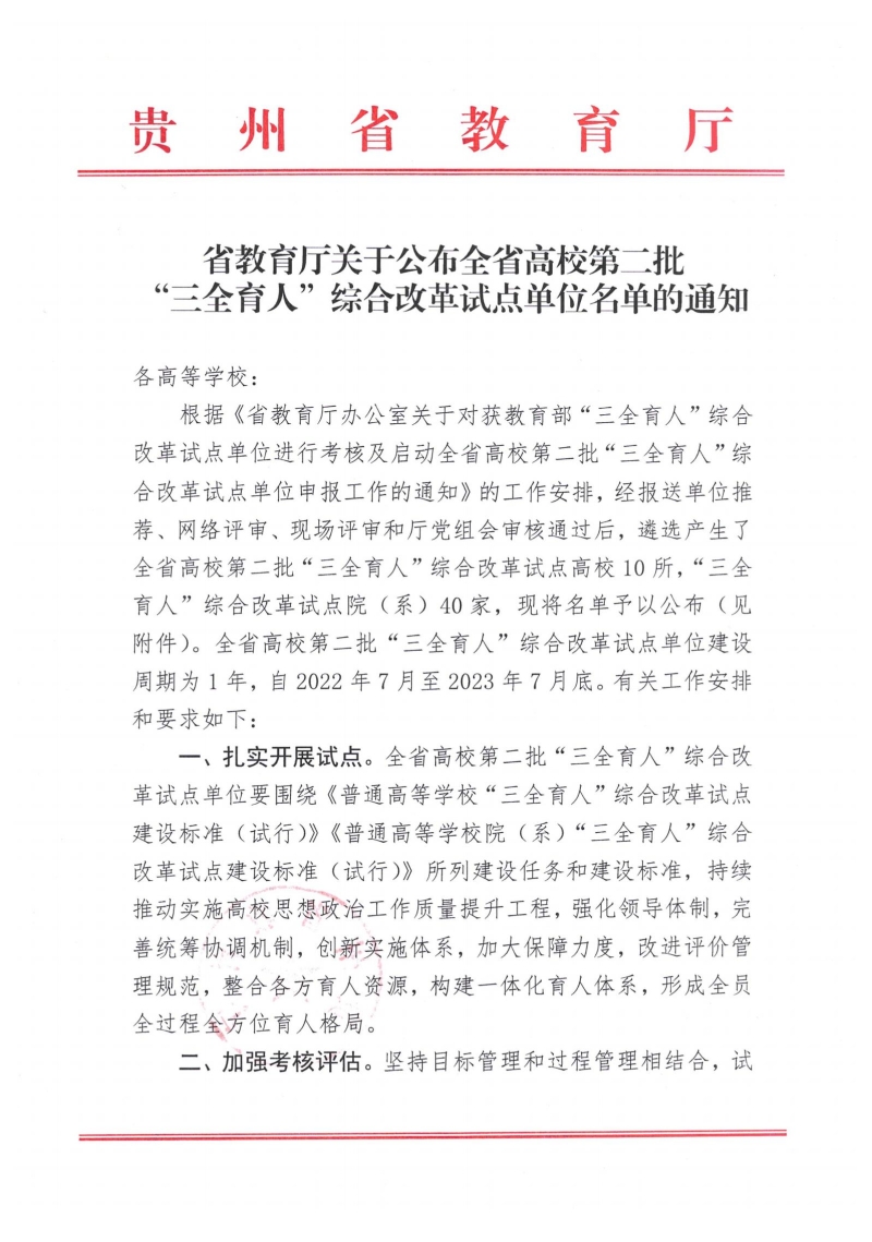 城建学院获批为“贵州省第二批‘三全育人’综合改革试点院(系)”培育创建单位