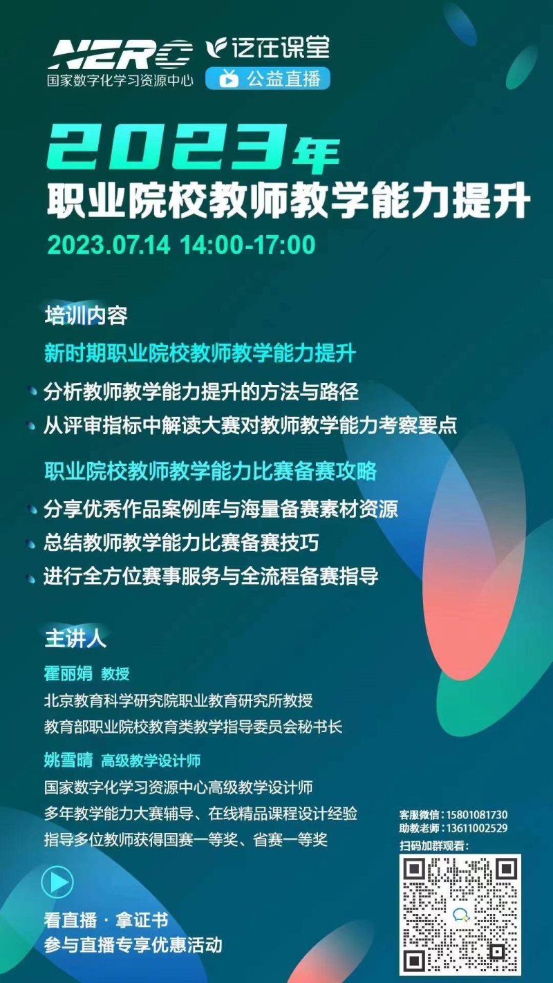 2023年教学能力比赛最新国赛方案发布之后规则有很多改动,故国家精品职教平台组织了一场新方案解读的公益直播,时间为周五(7月14日)下午2点,邀请资深专家解析国赛最新要求,请各位老师及时观看直播学习。