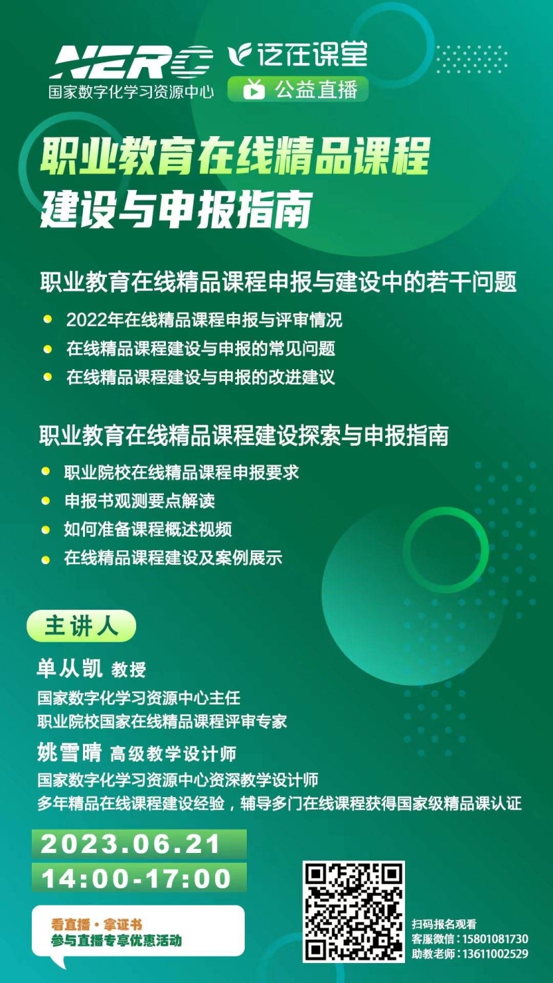 2023年职业教育国家精品课遴选在即,国家数字化资源中心作为支持单位,从数千个案例中总结分析,整理了精品课建设与申报的若干问题。本周三(6月21日)2点由国家精品课评审专家单从凯主讲直播,请各位老师根据需要报名并观看。